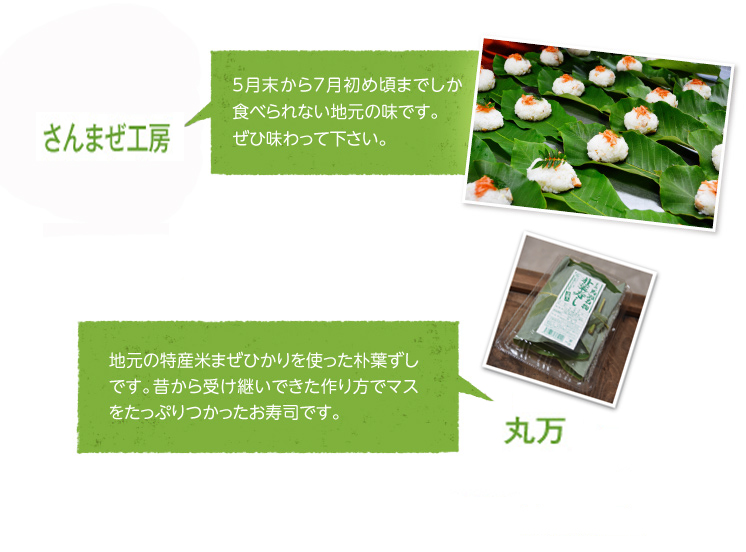 朴葉すし、朴葉みそ、まぜ大福などの食品製造、釣り人の憩いの店・喫茶たかを営業しています。
